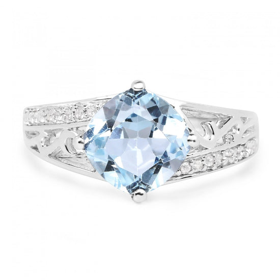 The centerpiece features a 2.30 CTW blue topaz in a radiant cushion cut, enhanced by sparkling white topaz accents (0.10 CTW, round cut). Together, they create a luminous play of color and shine that’s both timeless and modern.