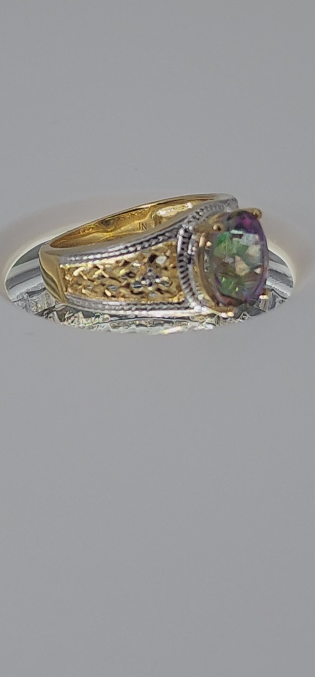 The mystic topaz radiates shifting rainbow tones that catch the light from every angle, while the diamonds add a touch of timeless brilliance. A perfect blend of bold color and refined craftsmanship, this ring is for women who refuse to blend in.