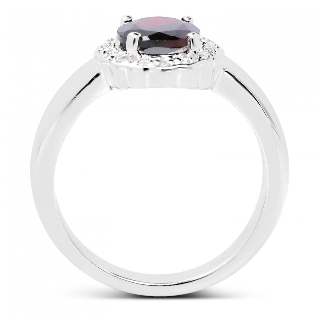 Elevate your elegance with this stunning ladies’ designer ring, crafted from premium sterling silver and finished with a sleek white gold rhodium plating. At its center lies a bold 2.50 CTW AA-grade oval-cut garnet, radiating a rich red hue that symbolizes passion and strength. Accented with sparkling 0.08 CTW white topaz gemstones, the contrast delivers a balance of fiery vibrance and refined brilliance.